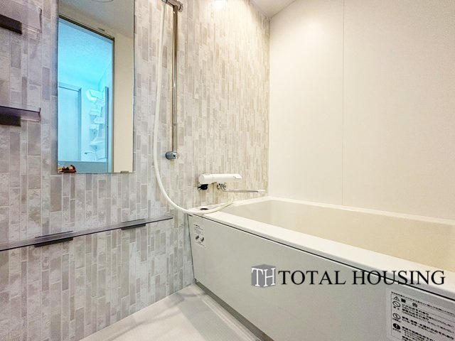 落ち着いた色調のアクセントパネルが施された浴室。寛ぎのバスタイムが実現しそうです。