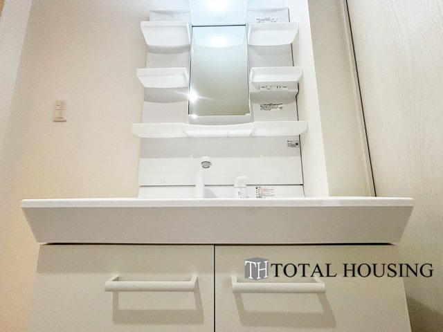 スタンダードなデザインの洗面ボウルは清潔感あるオフホワイトを採用。落ち着きとくつろぎを感じられる空間で気持ちよく身だしなみを整えられます。